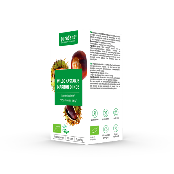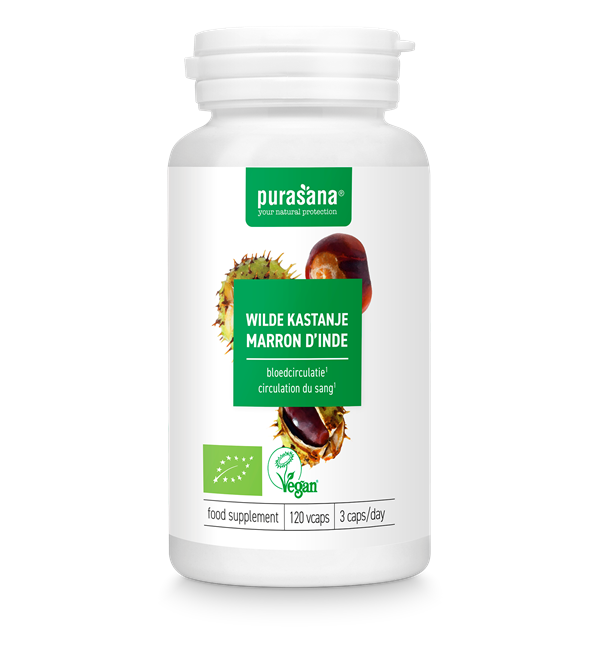 Wilde kastanje draagt bij tot een gezonde bloedsomloop, meer specifiek in de onderste ledematen. Kastanje helpt zo de beenaderfuncties gezond houden en het gevoel van zware benen verminderen.