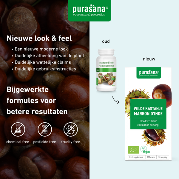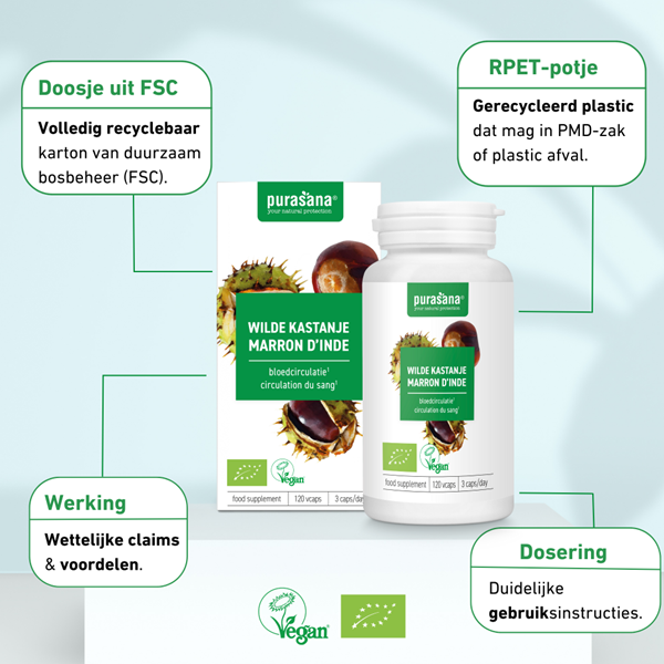 Wilde kastanje* (vrucht, Bulgarije): 240 mg, hydroxypropylmethylcellulose (capsule) *Afkomstig van biologische landbouw.