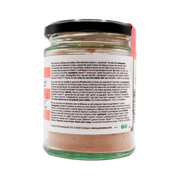 Ingrediënten: acaciagom* ‘Inavea™’, glutenvrije mix van maïs*, rijst*, gierst* en guargom*, lucuma*, kurkuma*, ashwagandha (5%)*, acerola* (acerola*, maltodextrine*), kaneel (3%)*, rode biet* (rode biet*, acaciagom* ‘Inavea™’). *biologische teelt