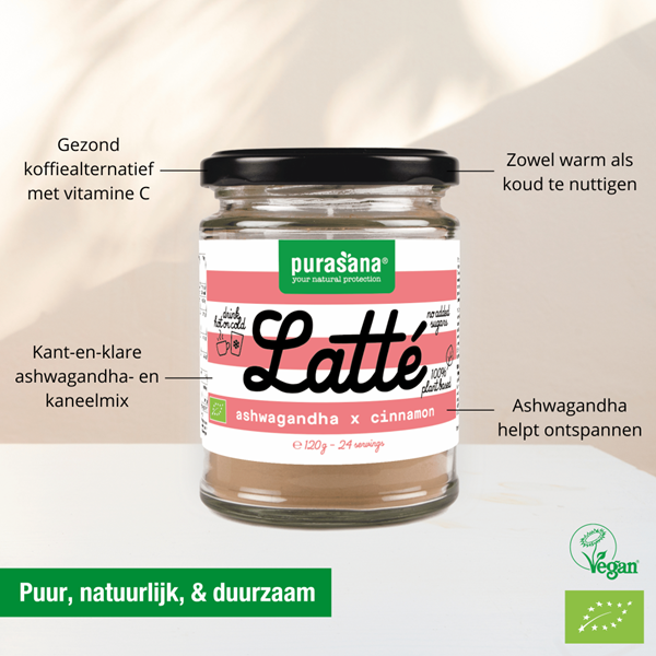 Nood aan een ontspannende break? Daar kan de latté met ashwagandha zeker bij helpen. Ashwagandha kan als adaptogeen het lichaam helpen ontspannen in geval van stress en angsten. Kaneel draagt bij tot normale bloedglucoseniveaus wat zal helpen om irritaties en een gebrek aan energie te verminderen.