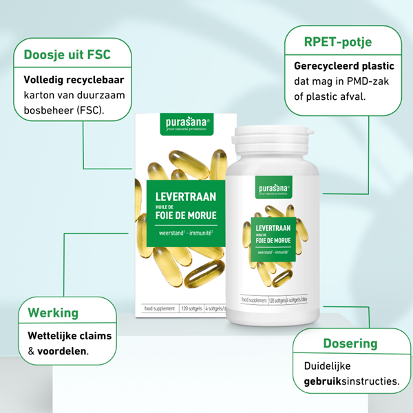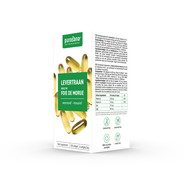 Het is een natuurlijke bron van de omega-3 vetzuren EPA en DHA. Daarnaast is levertraan rijk aan de vitamines A en D, die bijdragen tot de normale werking van het immuunsysteem.